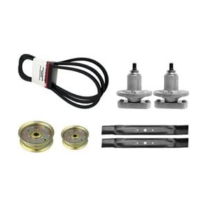This Rebuild Kit includes 2 Complete Deck Spindle Assemblies, 2 Mulching Blades, 1 OEM quality Deck Drive Belt, 1 Deck Idler Pulley, and 1 Deck Idler Pulley